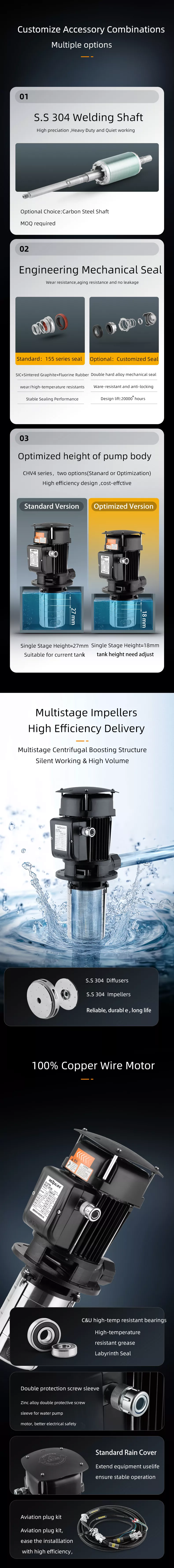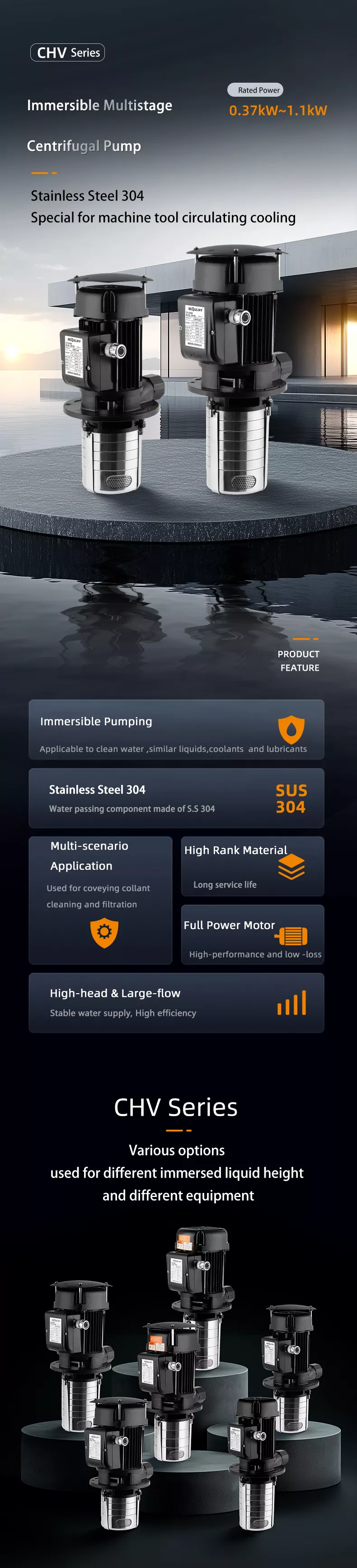 Berikut adalah pengenalan siri CHV Pam Centrifugal Multistage CHV Immersible, yang juga dikenali sebagai pam tenggelam atau mesin toopump, digunakan untuk menyampaikan alat penyejuk alat mesin, pelincir, pemindahan air kondensat, peralatan pembersihan industri, sistem penapisan, dan aplikasi lain yang sesuai untuk penggunaan pam terendam. LT sangat sesuai untuk integrasi dengan alat mesin, mesin pengisaran, pusat pemesinan CNC, mesin EDM, mesin pembersih industri, dan peralatan lain.