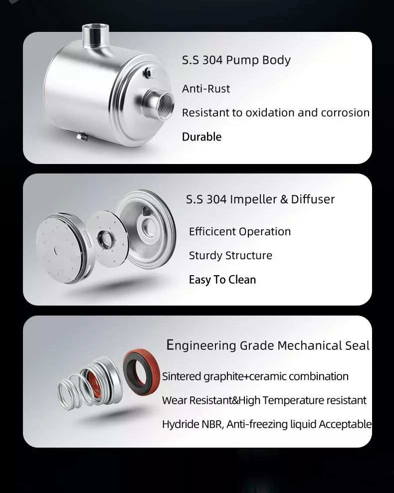 Ciri-ciri mesra pengguna: Pam multistage tekanan tinggi pintar dilengkapi dengan kawalan tekanan elecotronical pintar yang mesra pengguna, yang membolehkan operasi dan pemantauan mudah. Katakan selamat tinggal kepada persediaan rumit - Pam ini direka untuk menyelaraskan proses pam anda.