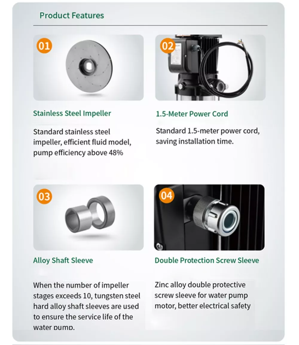 · Meterai mekanikal yang diperbuat daripada aloi keras + getah fluor mengurangkan kebocoran dan penggunaan tenaga, memastikan operasi yang lancar dan tenang.