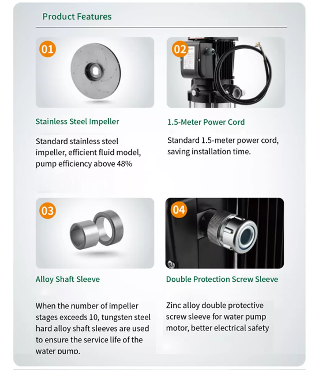 Kepala pam boleh diselaraskan dengan menukar bilangan pendesak untuk memenuhi pelbagai keperluan. Ia sesuai untuk air bersih atau cecair dengan sifat yang sama, manakala model tertentu boleh disesuaikan untuk media yang menghakis.